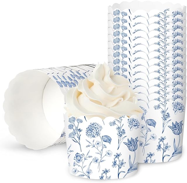 Order 100Pcs Blue Floral Paper Baking Cups Blue White Wildflower Cupcake Wrappers Scalloped Edge Cupcake Muffin Cases for Party Supplies today for a best price.