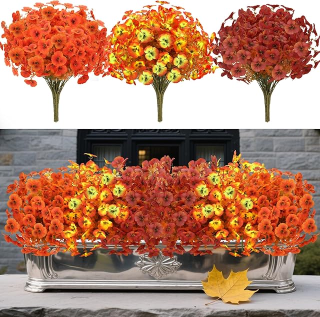 12 Bundles Artificial Fall Flowers, Faux Silk Artificial Pansies for Outdoors, UV Resistant Fall Wedding Kitchen Bathroom Front Door Porch Patio Garden Decor(Brown, Red, Yellow)