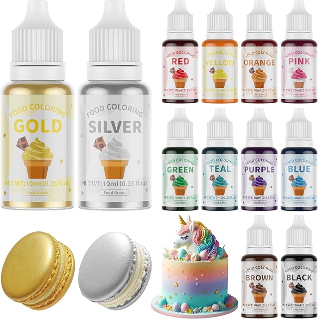 Order 12 Food Coloring Set,10 Colors Vibrant Food Dye & 2 Edible Metallic Gold Paint Food Grade Tasteless Liquid Baking Food Coloring for Cake Fondant Icing Making DIY Supplies Kit – 0.35 Fl. oz/Bottles today for a best price.