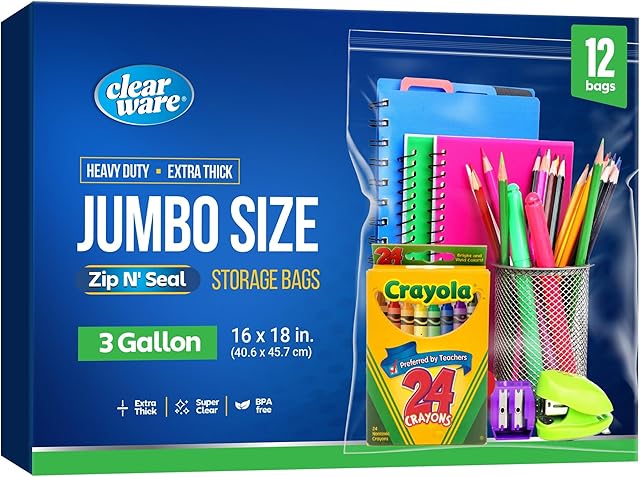 Order 12 Large Storage Bags With Zipper Top – 3 Gallon Size, 16″ x 18″, Extra Large Plastic for Clothes, Travel, Moving, Large Reusable freezer bags, BPA-Free, 2-mil Thick today for a best price.