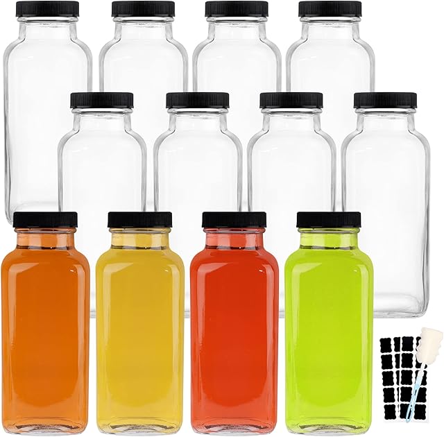 12 OZ Glass Drink Bottles, Set of 12 Vintage Glass Water Bottles with Lids, Great for storing Juices, Milk, Beverages, Kombucha and More (Labels and Sponge Brush Included)