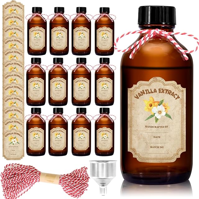 12 Pack 2 Ounce Amber Glass Bottle with Lids Vanilla Extract Homemade Brown Bottle 2 oz and 12Pcs Vanilla Extract Stickers for Syrup Gift Glass