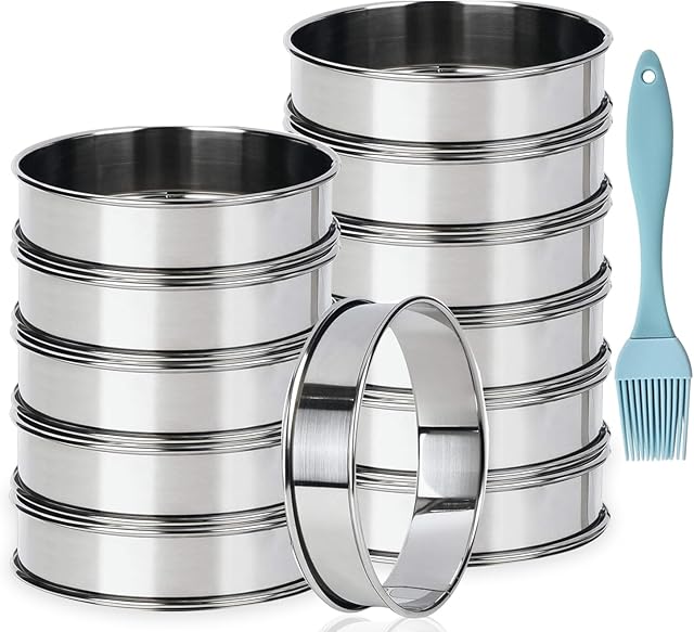 Order 12 Pack 4 Inch Metal English Muffin Ring Nonstick Crumpet Rings Stainless Steel Double Rolled Tart Molds with Silicone Brush for Kitchen Baking today for a best price.