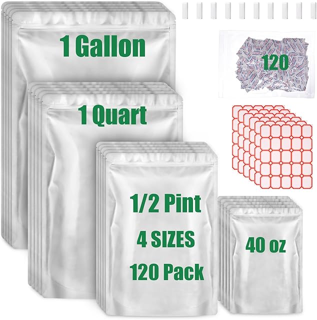 Order 120 Mylar Bags for Food Storage with Oxygen Absorbers 120 x 300cc, Mylar Bags 9 Mil 1 Gallon, 1 Quart, 1/2 Pint, 40 Oz, Stand-Up Zipper Resealable Bags & Heat Sealable Food Storage Bags + Labels today for a best price.