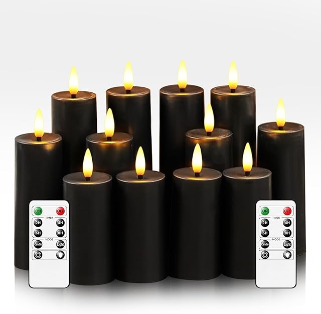12Pack Flameless LED Pillar Candles with Remote and Timer,Plastic Flickering Candles Battery Operated(D1.41 xH3.5 4.3″ 5.3″) Electric Candle for Home Decor Holiday Party,Black