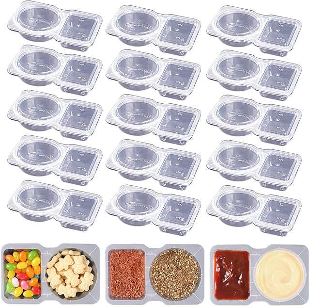 Order 15 Sets Double Compartment Condiment Containers with Lid, Transparent Small Plastic Dipping Containers for Condiments or Dips, Sauce Snack, Salad Dressing, Sampling, Travel Snack today for a best price.