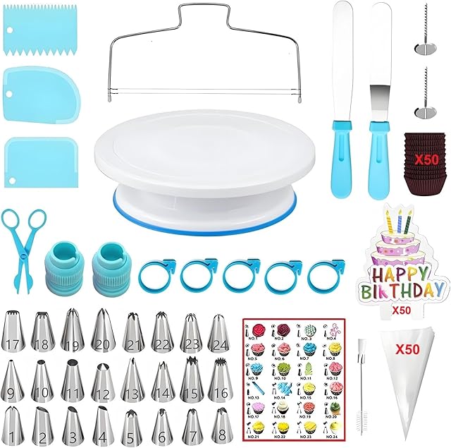 193 Pcs Cake Decorating Kit with Cake Turntable,Cake Leveler,24 Numbered Icing Tips,2 Spatulas,2 Couplers,3 Comb Scrapers,50 Pastry Bags,50 Paper Cupcake Liners,50 Cake Flags