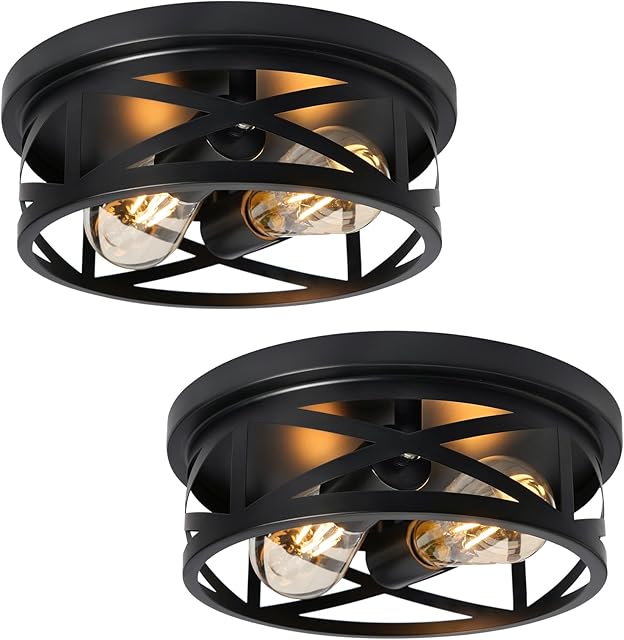 2-Light Flush Mount Ceiling Light Fixture, Farmhouse Ceiling Lights for Kitchen, Modern Black Close to Ceiling Light for Hallway Bedroom Balcony Porch Stairway, E26, (2 Pack)
