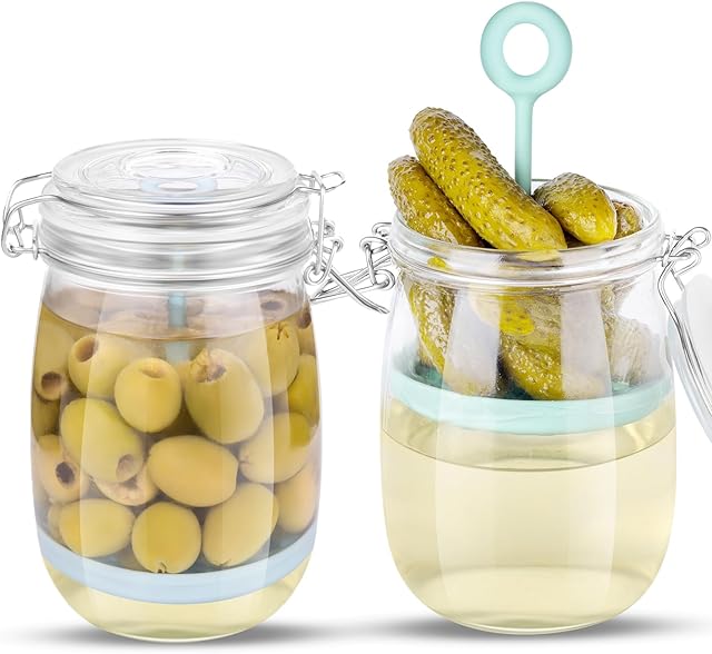 Order 2 Pack Glass Pickle Jar with Strainer, 34 OZ Pickle Storage Container Keeper with Lift Strainer, Juice Separator Jar with Leak Proof Airtight Lid for Olive Gherkin Jalapeno Christmas Gifts today for a best price.