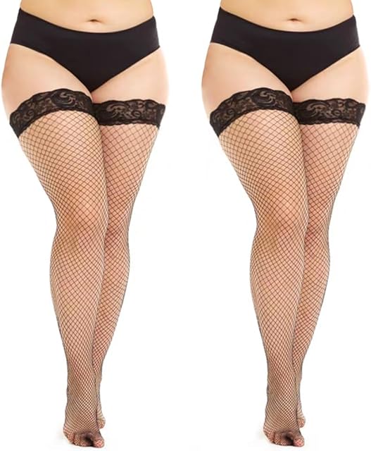 2 Pairs Plus Size Fishnet Stockings for Women,Silicone Lace Thigh High Stockings,Top Sheer Stay Up Lingerie Tights