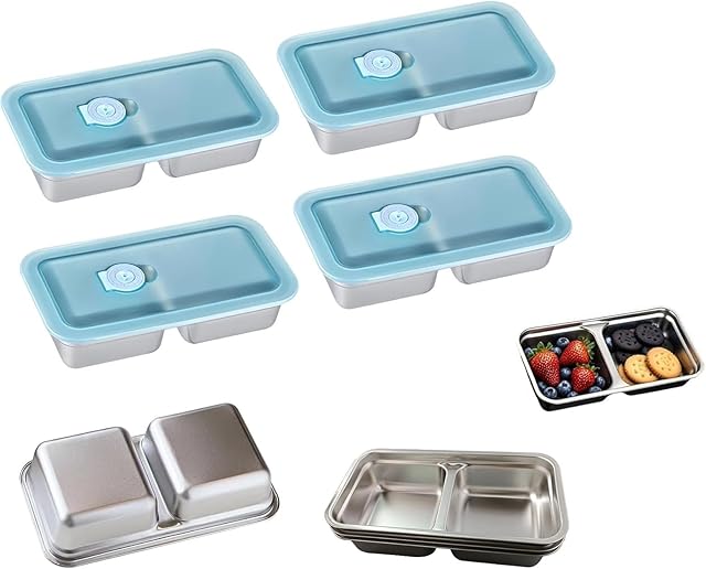 (4PCS) Grab and Go Snack Containers, Reusable Stainless Steel Snack Containers with Lids, Leak-Proof Stainless Steel Double Compartment Condiment Container, for Snacks Dips Travel