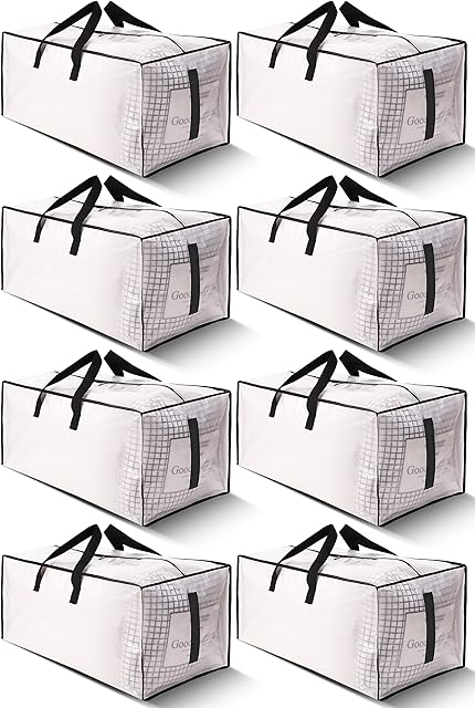 8 Pack Large Strong Moving Bags with Zippers & Carrying Handles – Water-Resistant – Heavy Duty Storage Tote for Space Saving, Fold Flat, Alternative to Moving Box (Semi-Transparent)