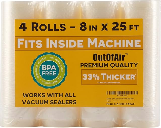 8″ x 25′ Rolls (Fits Inside Machine) – 4 Pack (100 feet total) OutOfAir Vacuum Sealer Rolls. Works with FoodSaver Vacuum Sealers. 33% Thicker, BPA Free, Sous Vide, Commercial Grade