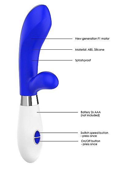 Luminous Achilles Ultra Soft Silicone 10 Speeds Royal Blue Vibrator from Shots Toys. Heel of the vibrator. The robust execution of the clitoral stimulator will make you gasp for air when you reach the big O! Made of high grade silicone and ABS. Comes with 2 extra strong F1 motors revving up to 5200rpm and 15000rpm in the curved tip for perfect G-Spot stimulation! The 10 different speed modes will make sure there is always something for everyone and at less than 60dB no one but you will know about your secret rendezvous. This beautiful toy requires 2 AAA batteries, not included. Approximately 30 minutes to 60 minutes of unbridled pleasurous play time! The Achilles Vibrator stands 8.27 inches tall and has a girth of 1.97 inches. Specifications: dimensions package 10.83 inches by 3.94 inches by 1.97 inches. Weight package 5.82 ounces. Product dimensions 8.27 inches by 2.64 inches by 2.76 inches. Product weight 4.2 ounces. Insertable length 4.53 inches. Quantity motors 2. Rotations per minute 7000rpm. Speed modes 10. Splashproof for shower play and easy clean up. Phthalate free, body safe materials Silky Smooth Silicone and ABS Plastic.
