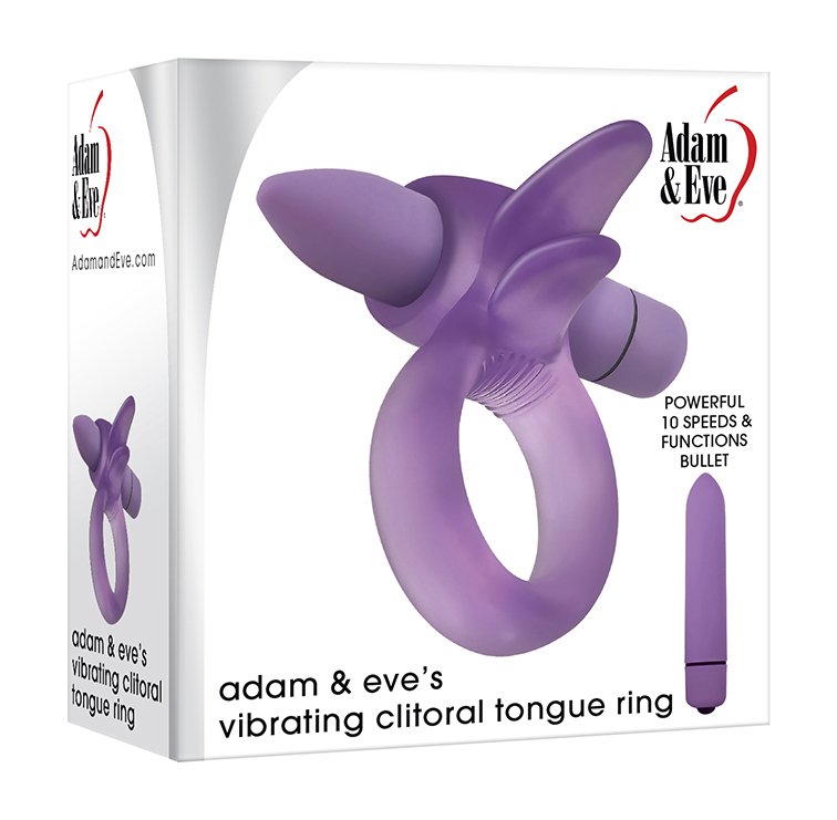Adam and Eve’s Vibrating Clitoral Tongue Ring from Evolved Novelties. Vibrating two tongue ring for couples. Encourages longer lasting erections. Double tongue clitoral stimulator. 10 vibrating speeds and functions. Stretchy textured Thermoplastic Elastomers TPE ring. Easy one button control. Removable ABS Plastic bullet vibrator. Size 2.55 inches long by 3.62 inches wide. Phthalate free, latex free. Bullet vibrator requires 1 AAA battery, not included. Waterproof vibrations.