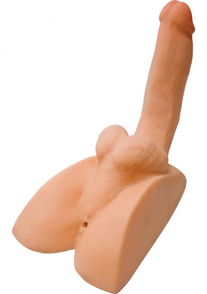 Give or receive with one of a kind CyberSkin ass stroker. Erect cock with bendable armature lets user position cock. Dual Density cock and balls are soft on the outside but firm on the inside. 7 insertable inches with 1.8 inches girth, hand painted tip and tight balls. Soft ass cheeks and snug hole. Thick ribbed inner tunnel mimics the sphincter muscle. Place finger over the exit hole to create suction. Open ended design. Waterproof and phthalate free. Made in the USA.