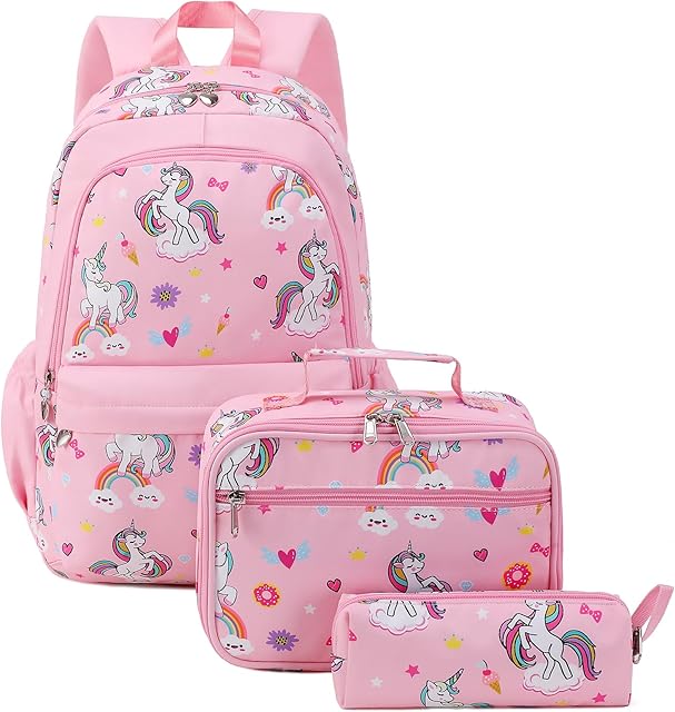 Backpack for Girls, Kids Unicorn Backpack Set, Elementary Primary Middle School Bookbag with Lunch Box and Pencil Case, Pink (Unicorn)