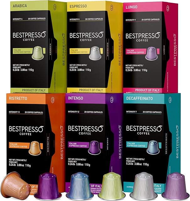 Bestpresso Coffee for Nespresso Original Machine 120 pods Certified Genuine Espresso Variety Pack includes one pack of decaf coffee, Pods Compatible with Nespresso Original