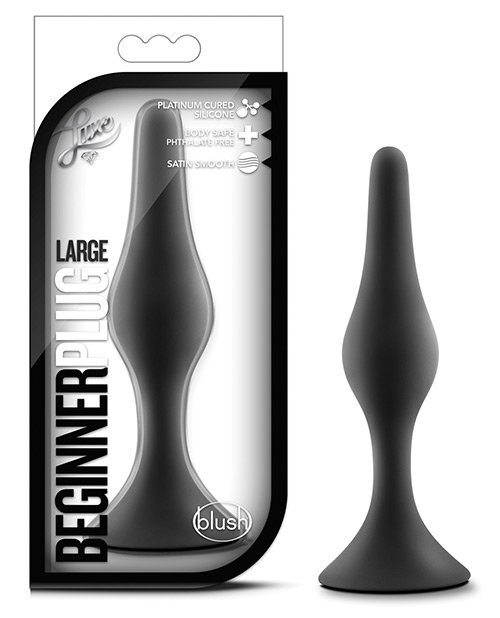 The Luxe Beginner Plug Large is designed to please and tease your backdoor. It's the perfect toy for safe and gentle anal play. This butt plug features a tapered tip for easy insertion and a tight neck for gentle pressure and extended wear. Perfect alone or with a lover, for new or experienced players alike! Made of satin smooth, platinum cured silicone, this toy is body safe and easy to clean. For the best experience, use with your favorite, high quality water-based lubricant. Material Type: Silicone Color: Black Insertable Length: 4 inches Length: 5.25 inches Width: 1.25 inches