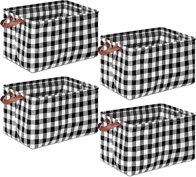 Boao 4 Pcs Buffalo Plaid Storage Baskets Black and White Bins Large Checkered Fabric Box with Handle Household Foldable Organizer Containers for Bathroom Bedroom(Simple Style)