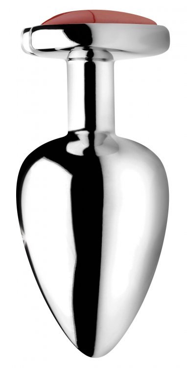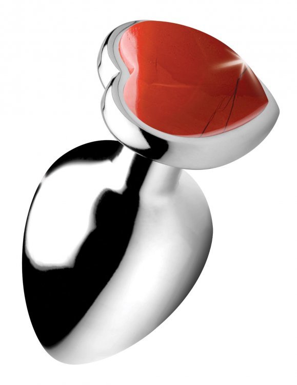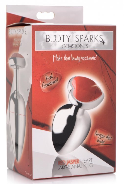 Booty Sparks Gemstones Large Heart Anal Plug Red Jasper from XR Brands. Energize your backdoor with this Red Jasper Heart! This metallic butt plug features an energetic Red Jasper gem to stir up passion and your supplement your inner strength. Stimulate your creativity, courage, and sexual energy, perfect for beginners and experts alike! Constructed with a body safe aluminum alloy that is easy to clean and compatible with most lubes so you can play with your favorite slippery stuff. Measurements: overall length 3.7 inches, insertable length 3.2 inches, diameter at widest point 1.6 inches. Materials: Aluminum alloy, Red Jasper. Color: Red, silver. Key features: genuine Heart shaped Red Jasper Gem energize your booty and ass a splash of red to represent your passion and inner strength; the genuine Red Jasper Gem aids in stimulating your creativity, courage, and sexual energy. Comfortably weighted. Add a downward pull to your hole for additional stimulation and pleasure thanks to the weighty nature of these metallic butt plugs Nickel Free Aluminum Alloy: the aluminum alloy material provides a deliciously hard and smooth mass for your ass to squeeze, compatible with most lubes. Great for temperature play: warm or chill this gemstone butt plug in a bowl of water to add another layer of sensation while you play, perfect for veteran butt plug users looking for a new way to play.