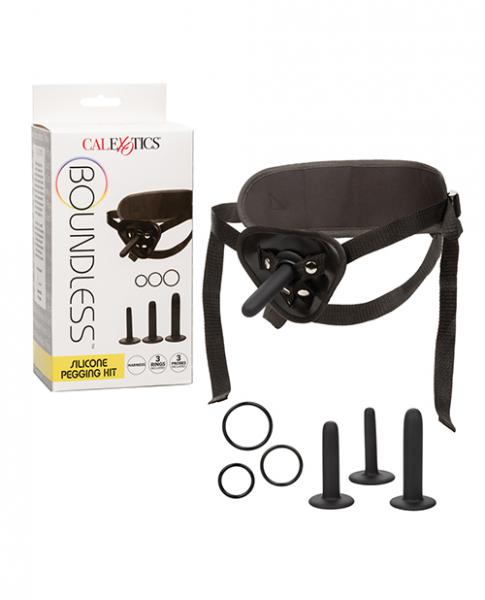 The Boundless Silicone Pegging Kit is made to thrust you into the thrilling world of endlessly satisfying pleasure. This anal pleasure set is made to play with 3 graduated sizes of pegging probes, a universal harness, and 3 graduated sizes of support rings. The sensual silicone probes are made to escalate in pleasure with 3 graduated sizes to ease you into the thrills of backdoor passions. Easily change the probe size with the set of 3 interchangeable harness rings to accommodate any dong, dildo, or Boundless harness toy. Stay comfortable even during the most vigorous pleasure play with the universal fit, fully adjustable thigh and waist straps, and supportive back band. Embrace uninhibited play, unrestrained pleasure and let your fantasies run wild with this harness and probe set.