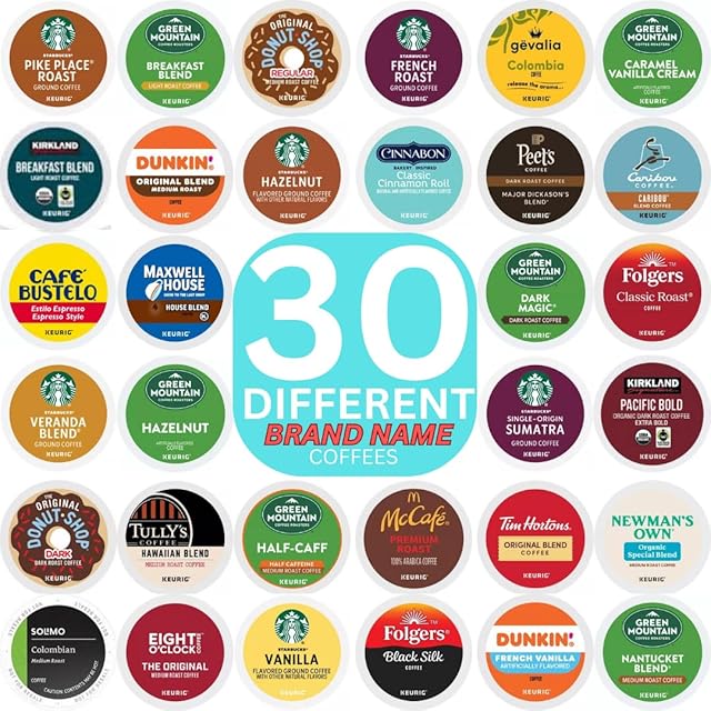 Brand Name Variety Pack Coffee Pods K Cup Sampler — Flavored, Dark, Medium & light Roast. All the Top Brands Including Starbucks, Donut Shop, Dunkin, McCafe, Peets, Green Mountain, Kirkland, Tullys, Gevalia, Maxwell, Cinnabon and Many More—for Keurig Brewers—1 box (30 Unique Pods)