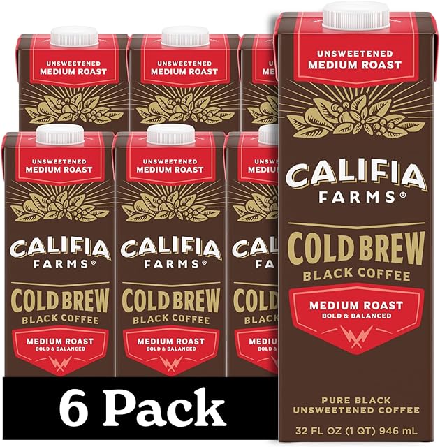 Califia Farms – Pure Black Medium Roast Cold Brew Coffee, 32 Oz (Pack of 6), 100% Arabica, Shelf Stable, Plant Based, Vegan, Gluten Free, Non GMO, Sugar Free, Iced Coffee