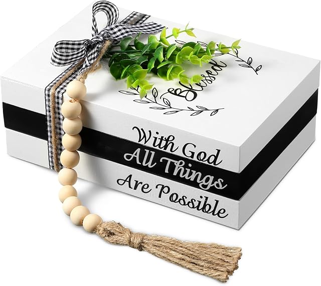 Capoda 3 Pcs Decorative Books for Home Decor Farmhouse Faux Stacked Books Wooden Rustic Table Decor with Bead Garland Twine Ribbon Faux Leaf for Table(Blessed)