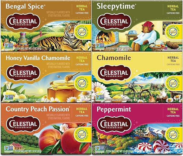Celestial Seasonings Herbal Tea Variety Pack, Bengal Spice, Sleepytime, Honey Vanilla Chamomile, Country Peach Passion, Peppermint & Chamomile, Caffeine Free, 20 Tea Bags (Pack of 6)