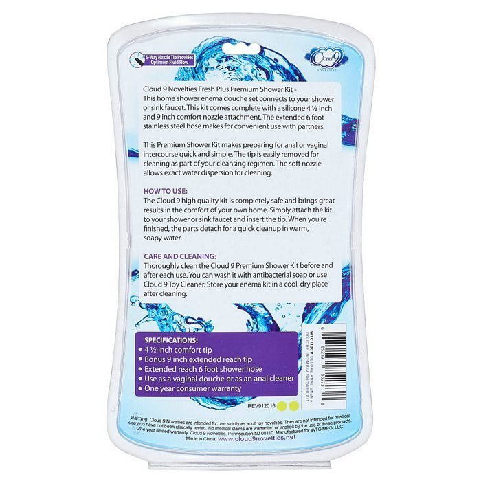 Cloud 9 Novelties Fresh Plus Premium Shower Kit with 2 tips and a 6 feet Stainless Steel Hose is a home shower enema douche set connects to your shower or sink faucet. This kit comes complete with a silicone 4.5 inches and 9 inches comfort nozzle attachment. The extended 6 foot stainless steel hose makes for convenient use with partners. This Premium Shower Kit makes preparing for anal or vaginal intercourse quick and simple. The tip is easily removed for cleaning as part of your cleansing regimen. The soft nozzle allows exact water dispersion for cleaning. How to use: the Cloud 9 high quality kit is completely safe and brings great results in the comfort of your own home. Simply attach the kit to your shower or sink faucet and insert the tip. When you are finished, the parts detach for a quick cleanup in warm, soapy water. Specifications: 4.5 inches comfort tip. Bonus 9 inches extended reach tip. Extended reach 6 foot shower hose. Use as a vaginal douche or as an anal cleaner. Care and cleaning: thoroughly clean the Cloud 9 Premium Shower Kit before and after each use. You can wash it with antibacterial soap or use Cloud 9 Toy Cleaner. Store your enema kit in a cool, dry place after cleaning. Warning: Cloud 9 Novelties are intended for use strictly as adult toy novelties. They are not intended for medical use and have not been clinically tested. No medical claims are warranted or implied by the use of these products. One year limited warranty. Cloud 9 Novelties, Pennsauken NJ 08110. Manufactured for WTC MFG, LLC. Made in China. 1 year warranty. Categories: Anal Douches, Enemas & Hygiene, Hygiene & Intimate Care, Health and Beauty. Amazon Restricted. 2022.