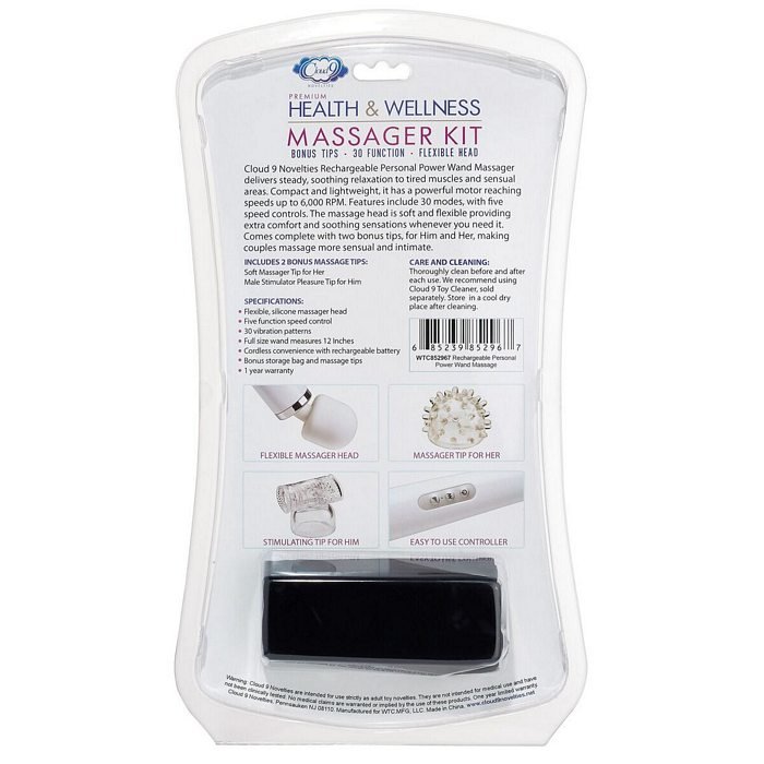 Cloud 9 Novelties Premium Health and Wellness Wand Kit with 2 Bonus Tips 30 Functions. Wand Body Massager is rechargeable. Personal power wand body massage kit with 2 bonus soft flexible tips. Personal Power Wand Massager delivers steady, soothing relaxation to tired muscles and sensual areas. Compact and lightweight, it has a powerful motor reaching speeds up to 6,000 RPM. Features include 30 modes, with five speed controls. The massage head is soft and flexible providing extra comfort and soothing sensations whenever you need it. Comes complete with two bonus tips, for him and her, making couples massage more sensual and intimate. Includes 2 bonus massage tips: soft massager tip for her, male stimulator pleasure tip for him. Specifications: flexible, silicone massager head. Five function speed control. 30 vibration patterns with easy 3 button control. Full size wand measures 12 inches. Cordless convenience with rechargeable battery. Includes 2 removable bonus tips for different sensations. Bonus storage bag. Care and cleaning: thoroughly clean before and after each use. Materials Silicone head, ABS plastic handle. We recommend using Cloud 9 Toy Cleaner, sold separately. Store in a cool, dry place. Video. MAPs price $59.00 added. 2021.