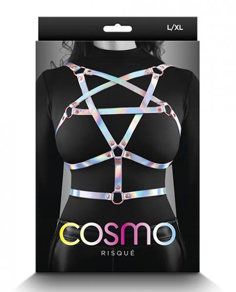 Dress up your assets with Cosmo's stylish chest harness. Accented with rose gold nickel-free hardware and adjustable straps for the perfect fit. Made from easy to clean vinyl. Cosmo harnesses are available in a variety of styles and sizes. Material: PU