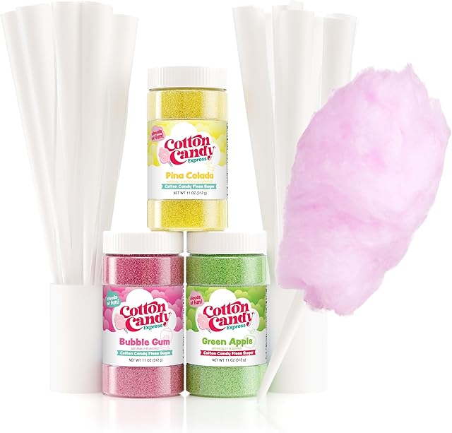 Cotton Candy Express Floss Sugar plus Cones with 3 – 11oz Plastic Jars of Bubble Gum, Green Apple & Pina Colada Flossing Sugars. 50 Paper Cones Included. Use with Cotton Candy Express Machine