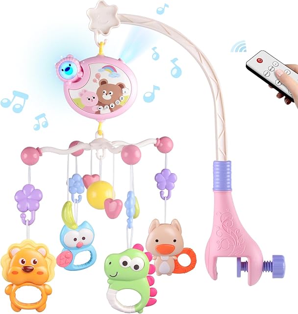 Crib Mobile with Music and Lights, Baby Mobiles for Cribs, Nursery Musical Mobile for Bassinets Toys Hanging Girls Boys, Pack and Play Space Portable Animal Mobile Hanger Arm Clip On Attachment