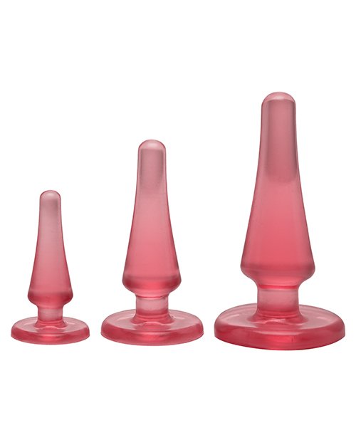The Crystal Jellies Anal Initiation Kit allows beginners to ease into backdoor play while enjoying each stage of intensity and fullness. Three classic plugs in smooth, body safe material sized at one inch intervals offer progressive levels of sensation, while flared bases and a firm yet flexible feel ensure safe and versatile fun. Experienced backdoor enthusiasts can also enjoy this set as the warm up for a night of more extreme intimate exploration. Color Pink. From Doc Johnson. Made in the USA