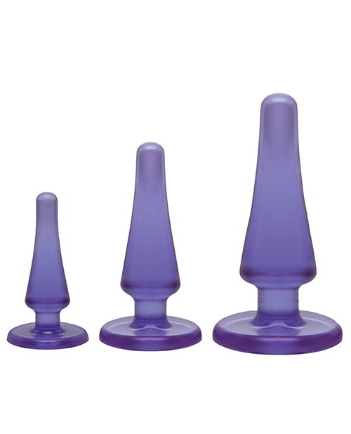The Crystal Jellies Anal Initiation Kit allows beginners to ease into backdoor play while enjoying each stage of intensity and fullness. Three classic plugs in smooth, body safe material sized at one inch intervals offer progressive levels of sensation, while flared bases and a firm yet flexible feel ensure safe and versatile fun. Experienced backdoor enthusiasts can also enjoy this set as the warm up for a night of more extreme intimate exploration. Color Purple. From Doc Johnson. Made in the USA