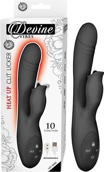Devine Vibes Heat Up Clitoral Licker Black from Nasstoys of New York. 10 functions. Dual motors. Body safe silicone. Heats up. RoHS compliant, phthalates free materials. Waterproof vibrations. Materials Shaft is made using silicone, Base is made using ABS Plastic. Size length 8.375 inches, insertable length 5 inches. Rechargeable, charging time 180 minutes, Working time 60 minutes.