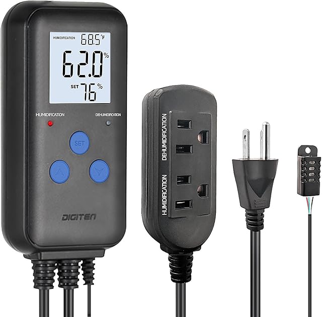DIGITEN Humidity Controller Pre-Wired Digital Humidistat with Temperature Display, Dual-Stage Outlet Humidifier /Dehumidifier for Mushroom,Reptile, Greenhouse, Fan, Grow Tent