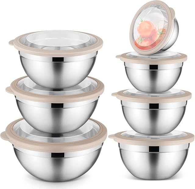 E-far Stainless Steel Mixing Bowls with Airtight Clear Lids Set of 7, Metal Nesting Bowls for Kitchen Prep, Baking, Cooking, Serving, Salad, Dishwasher Safe, Size 4.6, 3.5, 3, 2, 1.5, 1, 0.7QT, Khaki