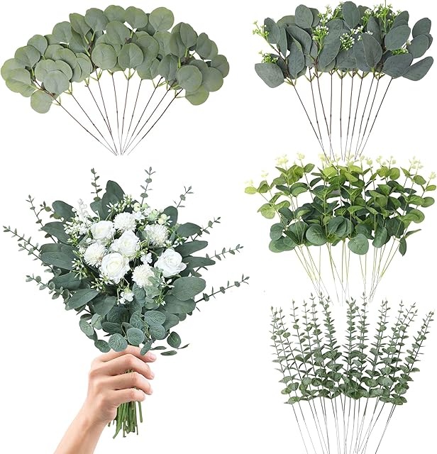 Eucalyptus Leaves Stems 60 PCS, 4 Kinds Mixed Artificial Greenery Stems for Wedding Decor Vase Floral Arrangement Centerpiece