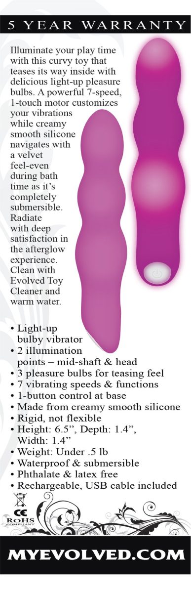 Evolved Aterglow Pink Vibrator from Evolved Novelties. Light up vibrator. Illuminate your play time with this curvy toy that teases its way inside with delicious light up pleasure bulbs. A powerful 7 speed, one touch motor customizes your vibrations while creamy silicone navigates with a velvet feel even during bath time and it is completely submersible. Radiate with deep satisfaction in the afterglow experience. Clean with Evolved Novelties Toy cleaner. Size 6.5 inches by 1.4 inches by 1.4 inches. Waterproof vibrations. USB rechargeable. 5 year warranty.