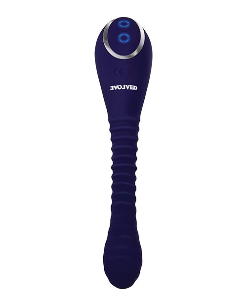Evolved Bendable Sucker from Evolved Novelties. This double ended toy features a suction stimulator on one end and a powerful ribbed vibrator on the other. Experience undulating waves of suction that tease and target the clitoris with an extraordinary touch free feeling that builds intense pleasure in even the most sensitive people. Flip the toy to enjoy the slim, textured vibe on the opposite end, and experiment with all the dual possibilities in between! The two sensations are joined with a flexible, posable shaft that bends to your needs, allowing unique hands free positions. Fully rechargeable and easy to clean. Splashproof, not submersible. Length 8.75 inches, depth1.97 inches, width 1.88 inches. Insertable length 6 inches. USB rechargeable cable included. 5 years warranty.