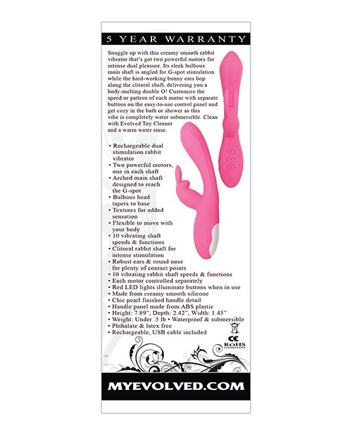 Snuggle up with this creamy smooth rabbit vibrator that's got two powerful motors for intense dual pleasure. Its sleek bulbous main shaft is angled for G-spot stimulation while the hard-working bunny ears bop along the clitoral shaft, delivering you a body-melting double O! Customize the speed or pattern of each motor with separate buttons on the easy-to-use control panel and get cozy in the bath or shower as this vibe is completely water submersible.