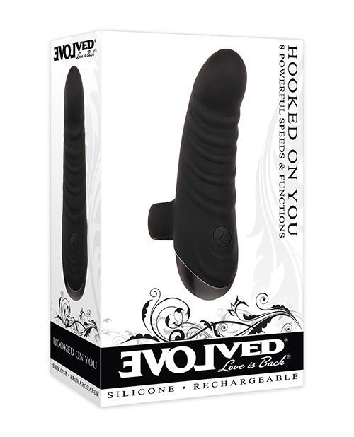 Evolved Hooked On You Finger Vibrator. Pure pleasure at your fingertips! This robust 8 speed mini vibe pops onto any digit for a powerful boost with tantalizing ribbed textures. Its curved little shaft will point, nestle and massage its way into top billing on your nightstand whether you are slipping it on yourself or onto a partners eager finger. Buzz away during bath time too, as it is completely water submersible. Fully rechargeable. Easy to use 1 button control. Features: textured, curved finger vibrator. Rigid shaft, flexible ring. 8 powerful speeds and functions. White LED illuminates button when in use. Made from silky smooth silicone. Base made from black chrome ABS plastic. Height 3.64 inches, depth 1.9 inches, width 1.07 inches. Weight under .5 pound. Waterproof vibration for submersible play. Phthalate free and latex free. Clean with Evolved Toy Cleaner and a warm water rinse. Rechargeable, USB cable included. 5 years warranty.