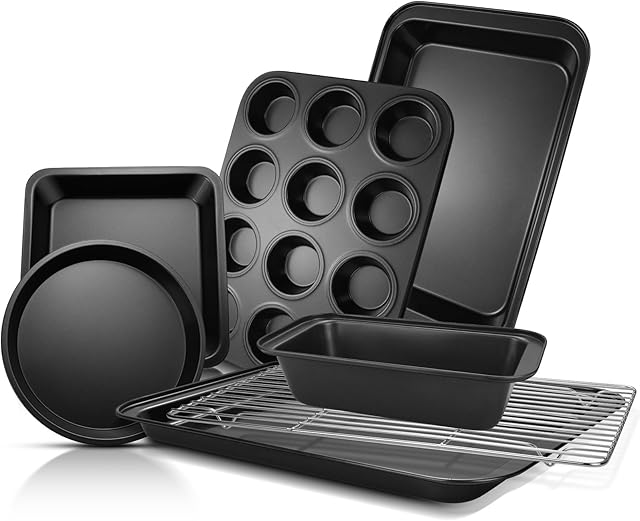 EWFEN Bakeware Sets, Baking Pans Set, Nonstick Oven Pan for Kitchen with Wider Grips, 7-Piece with Round/Square Cake Pan, Loaf Pan, Muffin Pan, Cookie Sheet, Roast Pan, Cooling Rack, Carbon Steel Bake