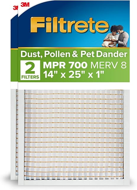 Filtrete 14x25x1 AC Furnace Air Filter, MPR 700, MERV 8, Tough on Pollen, Easy on Airflow, 3-Month Pleated 1-Inch Electrostatic Air Cleaning Filter, 2-Pack (Actual Size 13.81 x 24.81 x 0.81 in)