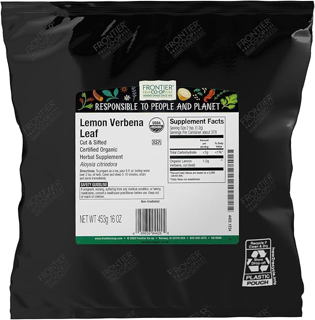 Frontier Co-op Organic Cut and Sifted Lemon Verbena Leaf 1lb – Loose Leaf Lemon Verbena Tea – Cafe, Restaurant Supply – Resealable Wholesale Bulk Bag