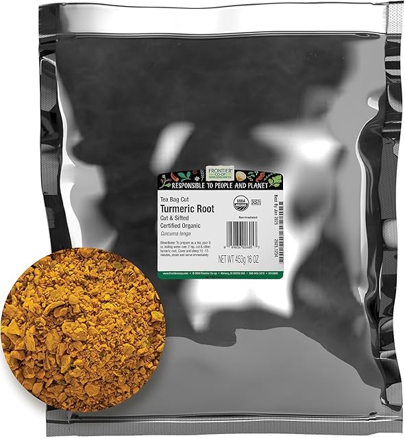 Frontier Organic Tea Bag Cut Turmeric Root, 1-Pound Bulk, Ideal for Iced Tea, Pickling Brines, Hot Tea, Sweet, Warm, Peppery