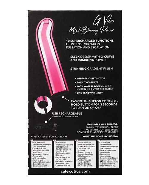 The shining Glam G Vibe bullet is a sleek G-curve vibrator packed with 10 functions of high-intensity vibration. Fiercely powerful and whisper-quiet, this gorgeous gradient G bullet is ready to play wherever pleasure takes you. Add a touch of glamour to your toy box with the bold metallic ombr? finish.